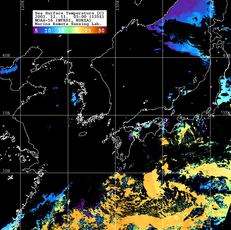 o 2003년 12월 11일 03시 00분 NOAA-16호 위성영상입니다. o 수온분포는 범례를 참고하시기 바랍니다. o 검은색은 구름과 육지를 나타냅니다.