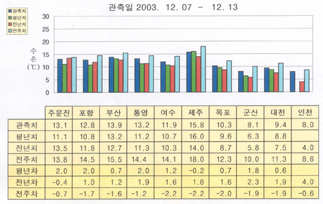 o 최근(2003. 12. 07∼12. 13)의 한반도 연안 표면수온은 동해 연안역에서