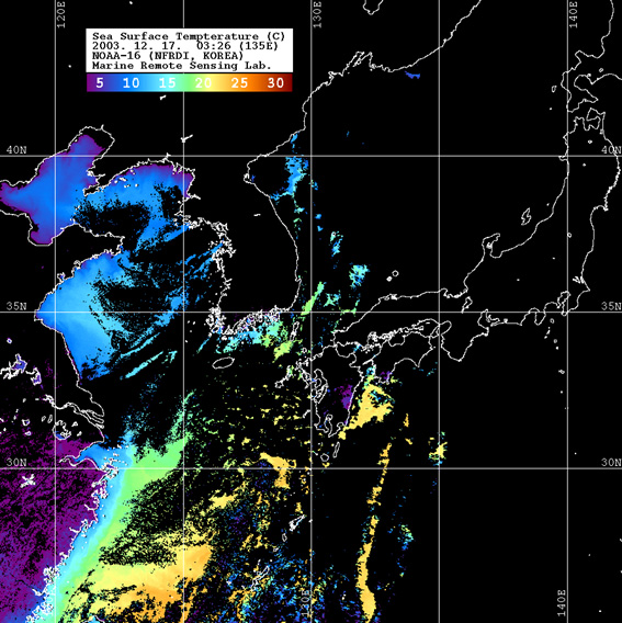 o 2003년 12월 17일 03시 26분 NOAA-16호 위성영상입니다. o 수온분포는 범례를 참고하시기 바랍니다. o 검은색은 구름과 육지를 나타냅니다.