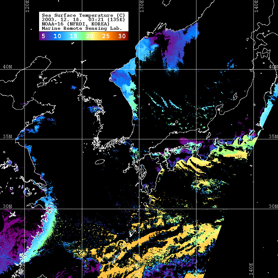 o 2003년 12월 18일 03시 21분 NOAA-16호 위성영상입니다. o 수온분포는 범례를 참고하시기 바랍니다. o 검은색은 구름과 육지를 나타냅니다.