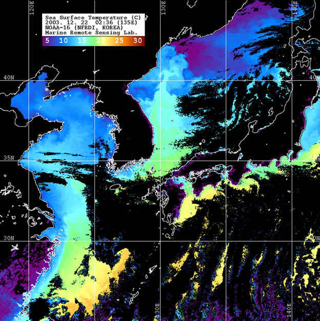o 2003년 12월 22일 02시 36분 NOAA-16호 위성영상입니다. o 수온분포는 범례를 참고하시기 바랍니다. o 검은색은 구름과 육지를 나타냅니다.