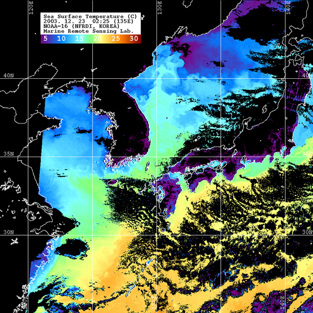 o 2003년 12월 23일 02시 25분 NOAA-16호 위성영상입니다. o 수온분포는 범례를 참고하시기 바랍니다. o 검은색은 구름과 육지를 나타냅니다.