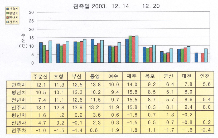 o 최근(2003. 12. 14∼12. 20)의 한반도 연안 표면수온은 동해 연안역에서 섭씨 11∼12도, 남해 연안역에서 10∼13도, 서해 연안역에서 5∼9도 내외로 나타납니다.