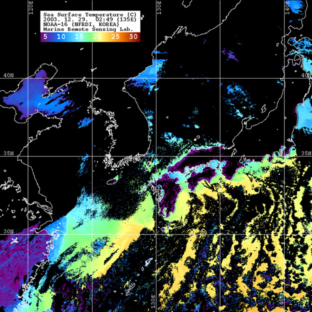 o 2003년 12월 29일 02시 49분 NOAA-16호 위성영상입니다. o 수온분포는 범례를 참고하시기 바랍니다. o 검은색은 구름과 육지를 나타냅니다.