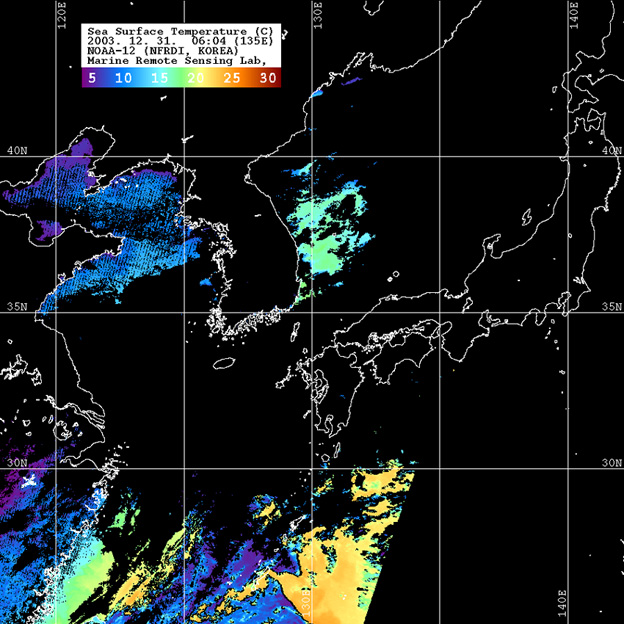 o 2003년 12월 31일 06시 04분 NOAA-12호 위성영상입니다. o 수온분포는 범례를 참고하시기 바랍니다. o 검은색은 구름과 육지를 나타냅니다.