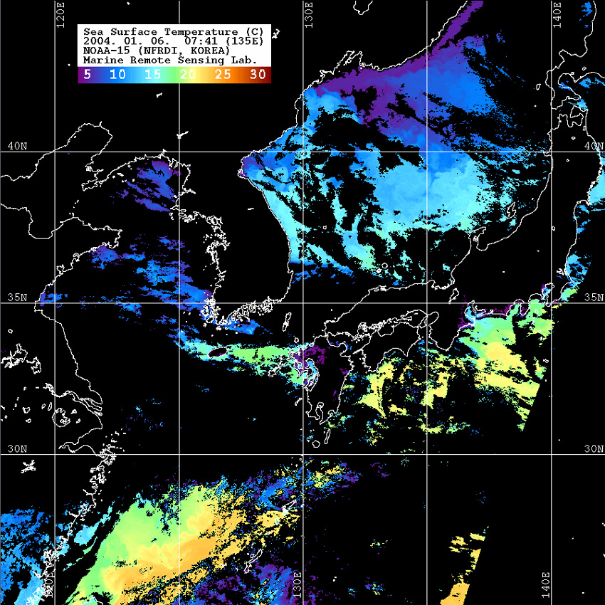 o 2004년 01월 06일 07시 41분 NOAA-15호 위성영상입니다. o 수온분포는 범례를 참고하시기 바랍니다. o 검은색은 구름과 육지를 나타냅니다.