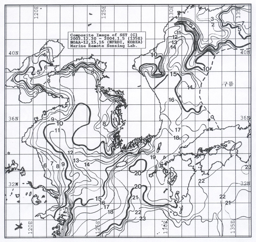o 아래 그림은 2003년 12월 30일부터 2004년 1월 5일 까지 합성한 위성추정 표면 수온 분포도입니다. o 울릉도 근해 14∼15도, 대마도 근해 18∼19도, 제주도 근해 15∼19도, 이어도 근해 13∼15도, 일향초 근해 10∼12도, 어청도 근해 10∼11도 내외로 나타납니다. o「평년에 비해」수온은 울릉도 근해 1.5도 높게, 대마도 근해 2도 높게, 제주도 및 이어도 1도 높게, 일향초 0.5도 낮게, 어청도 근해 3도 높게 나타납니다. o 수온전선대는 수온 15도를 중심으로 거제도∼거문도∼ 이어도 동방 10km 해역에서 형성됩니다. < 위의 그림을 클릭하시면 확대된 수온정보를 보실 수 있습니다 >