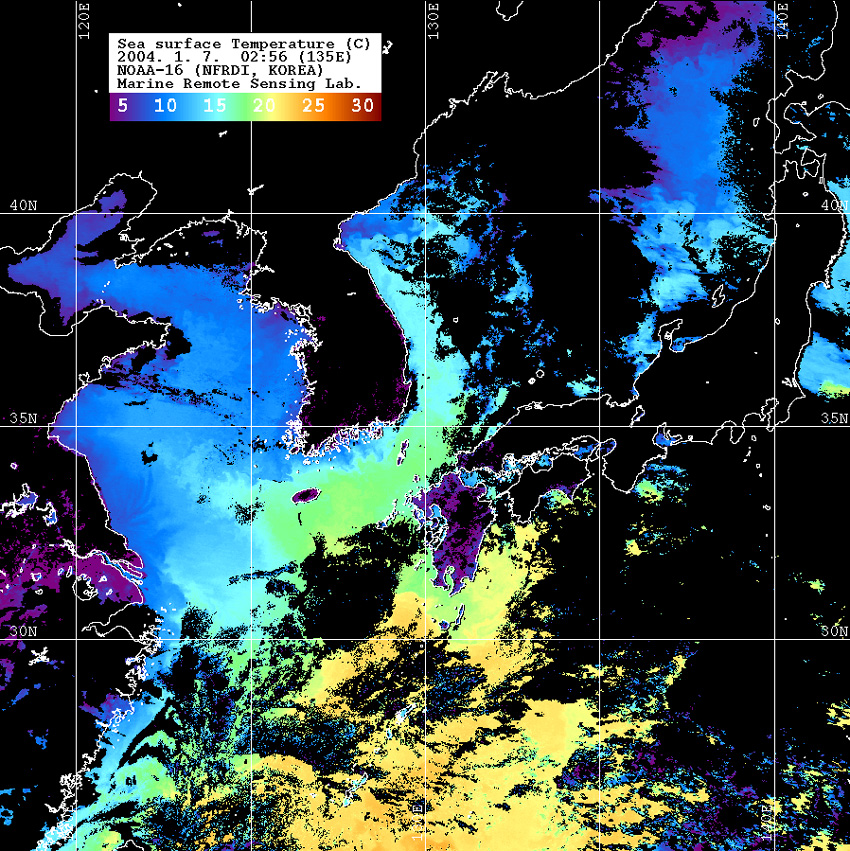o 2004년 01월 07일 02시 56분 NOAA-16호 위성영상입니다. o 수온분포는 범례를 참고하시기 바랍니다. o 검은색은 구름과 육지를 나타냅니다.