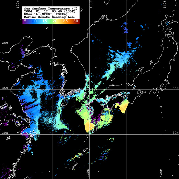 o 2004년 01월 12일 03시 40분 NOAA-16호 위성영상입니다. o 수온분포는 범례를 참고하시기 바랍니다. o 검은색은 구름과 육지를 나타냅니다.