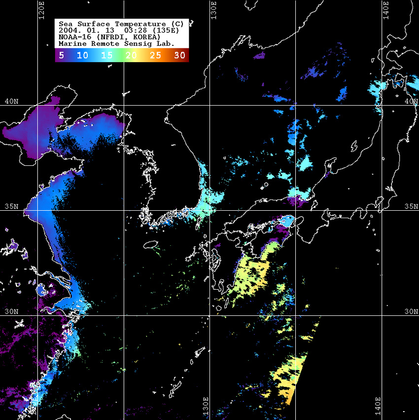 o 2004년 01월 13일 03시 28분 NOAA-16호 위성영상입니다. o 수온분포는 범례를 참고하시기 바랍니다. o 검은색은 구름과 육지를 나타냅니다.