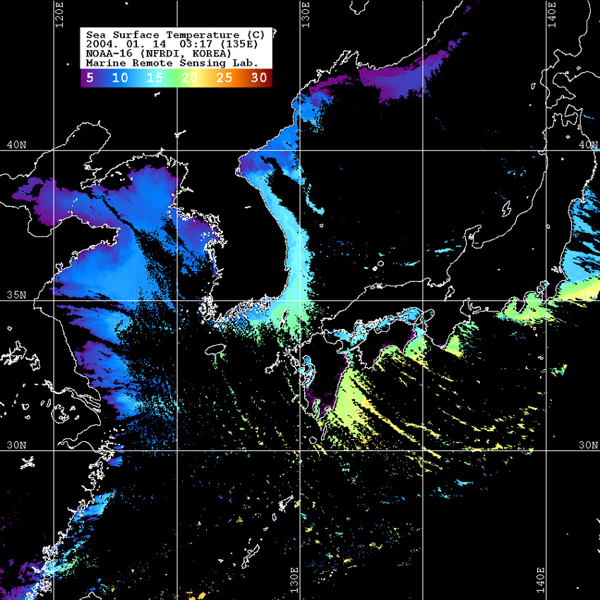 o 2004년 01월 14일 03시 17분 NOAA-16호 위성영상입니다. o 수온분포는 범례를 참고하시기 바랍니다. o 검은색은 구름과 육지를 나타냅니다.