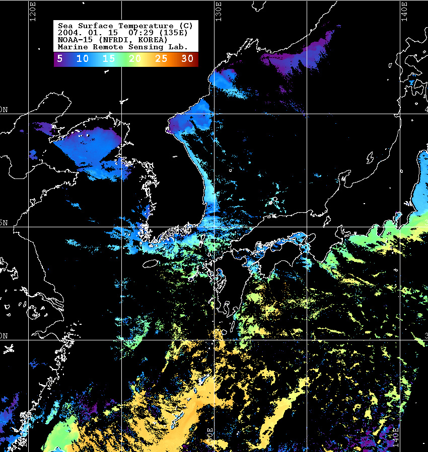 o 2004년 01월 15일 07시 29분 NOAA-15호 위성영상입니다. o 수온분포는 범례를 참고하시기 바랍니다. o 검은색은 구름과 육지를 나타냅니다.