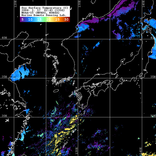 o 2004년 01월 17일 02시 43분 NOAA-16호 위성영상입니다. o 수온분포는 범례를 참고하시기 바랍니다. o 검은색은 구름과 육지를 나타냅니다.