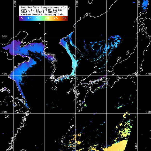 o 2004년 01월 19일 07시 35분 NOAA-15호 위성영상입니다. o 수온분포는 범례를 참고하시기 바랍니다. o 검은색은 구름과 육지를 나타냅니다.