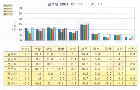 o 최근(2004. 01. 11∼ 01. 17)의 한반도 연안 표면수온은 동해 연안역에서 섭씨 10∼12도, 남해 연안역에서 7.5∼14.5도, 서해 연안역에서 2.5∼6도 내외로 나타납니다.