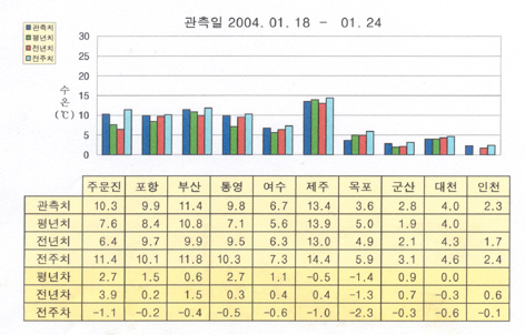 o 최근(2004. 01. 18∼ 01. 24)의 한반도 연안 표면수온은 동해 연안역에서 섭씨 10∼11도, 남해 연안역에서 6.5∼13.5도, 서해 연안역에서 2.5∼4도 내외로 나타납니다.