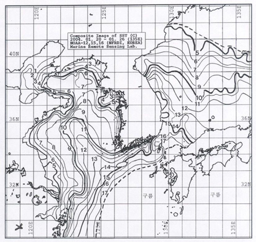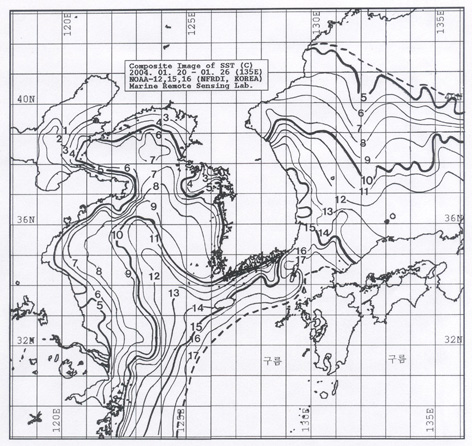 o 아래 그림은 2004년 1월 20일부터 1월 26일 까지 합성한 위성추정 표면 수온 분포도입니다.
