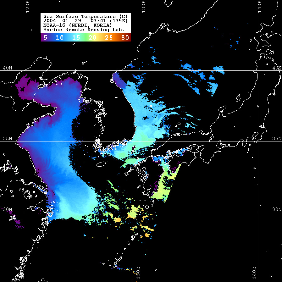 o 2004년 01월 29일 03시 41분 NOAA-16호 위성영상입니다. o 수온분포는 범례를 참고하시기 바랍니다. o 검은색은 구름과 육지를 나타냅니다.