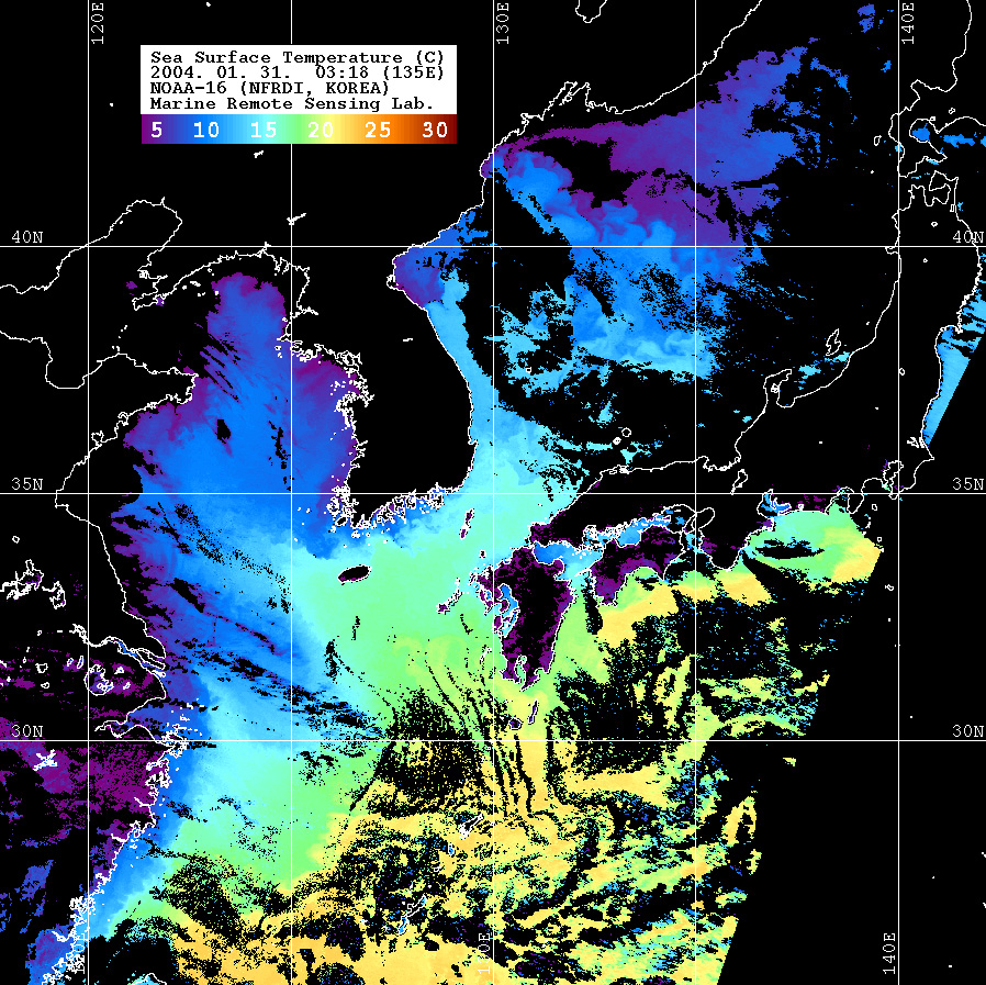 o 2004년 01월 31일 03시 18분 NOAA-16호 위성영상입니다. o 수온분포는 범례를 참고하시기 바랍니다. o 검은색은 구름과 육지를 나타냅니다.