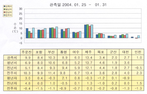 o 최근(2004. 01. 25 ∼ 01. 31)의 한반도 연안 표면수온은 동해 연안역에서 섭씨 8.5∼10도, 남해 연안역에서 6∼13.5도, 서해 연안역에서 1∼3.5도 내외로 나타납니다.