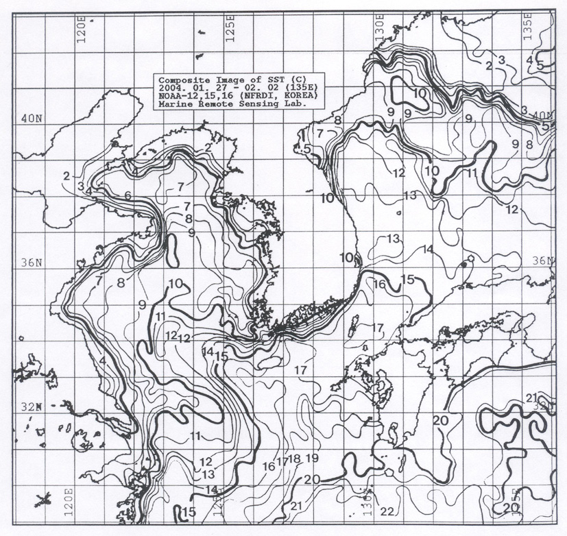 o 아래 그림은 2004년 1월 27일부터 2월 2일 까지 합성한 위성추정 표면 수온 분포도입니다.