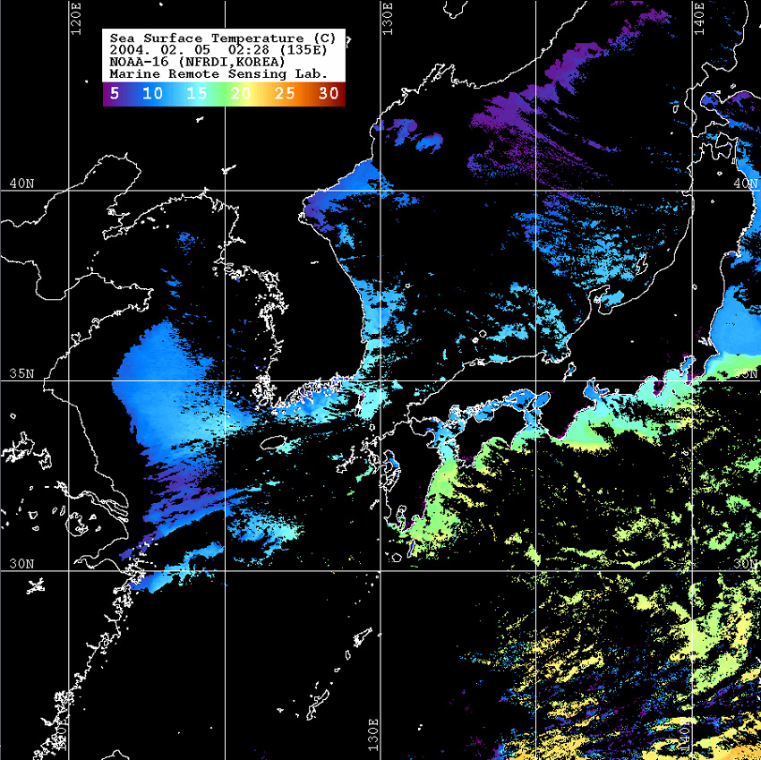 o 2004년 02월 05일 02시 28분 NOAA-16호 위성영상입니다. o 수온분포는 범례를 참고하시기 바랍니다. o 검은색은 구름과 육지를 나타냅니다.