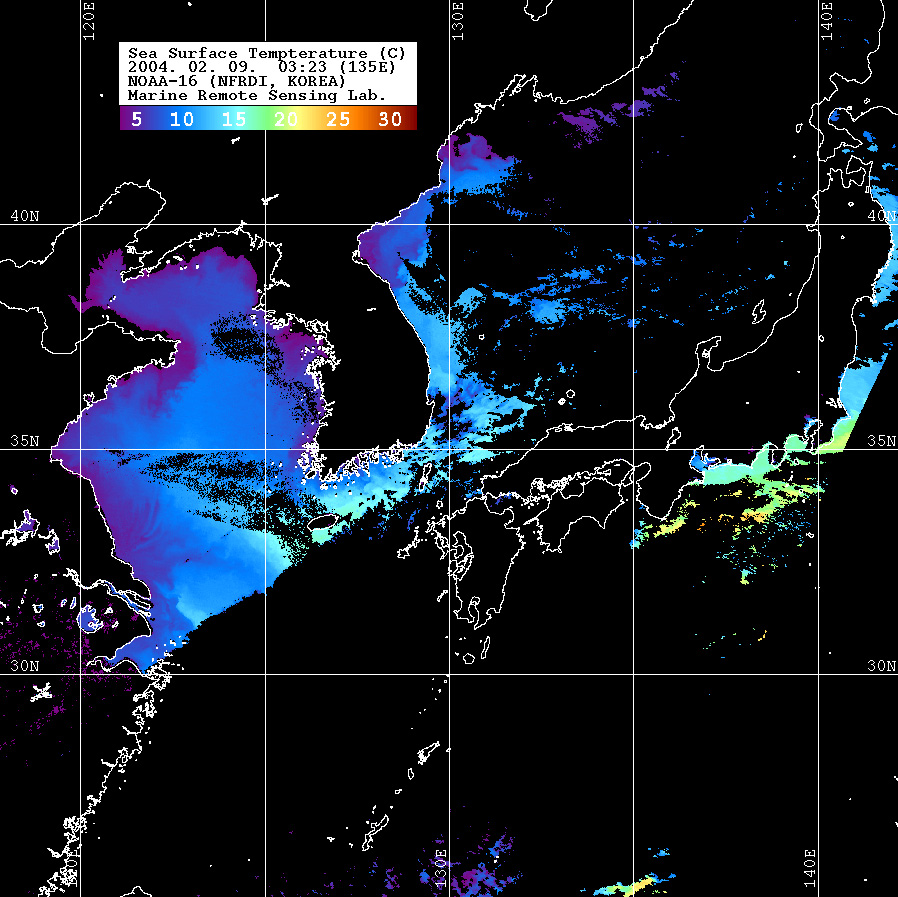 o 2004년 02월 09일 03시 23분 NOAA-16호 위성영상입니다. o 수온분포는 범례를 참고하시기 바랍니다. o 검은색은 구름과 육지를 나타냅니다.