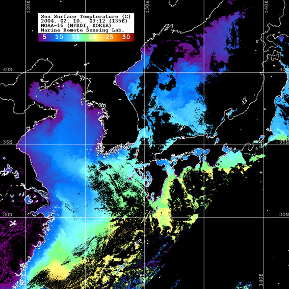 o 2004년 02월 10일 03시 12분 NOAA-16호 위성영상입니다. o 수온분포는 범례를 참고하시기 바랍니다. o 검은색은 구름과 육지를 나타냅니다.