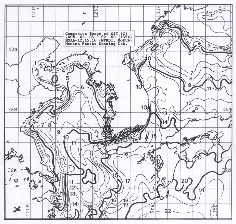 o 아래 그림은 2004년 2월 3일부터 2월 9일 까지 합성한 위성추정 표면 수온 분포도입니다. o 대화퇴 근해 5∼7도, 울릉도 근해 11∼12, 대마도 근해 15∼16도, 제주도 근해 14∼16도, 이어도 근해 10∼11도, 일향초 근해 9∼10도, 어청도 근해 4∼6도 내외로 나타납니다. o 「평년에 비해」수온은 대화퇴 근해 2도 낮게, 울릉도 근해 및 대마도 근해 1도 높게, 제주도 근해 0.5도 높게, 이어도 및 일향초 비슷하게, 어청도 근해 0.5도 낮게 나타납니다. o 수온전선대는 수온 13도를 중심으로 이어도 동쪽 150km 외해와 거문도∼거제도를 잇는 해역에서 형성됩니다. < 위의 그림을 클릭하시면 확대된 수온정보를 보실 수 있습니다 >