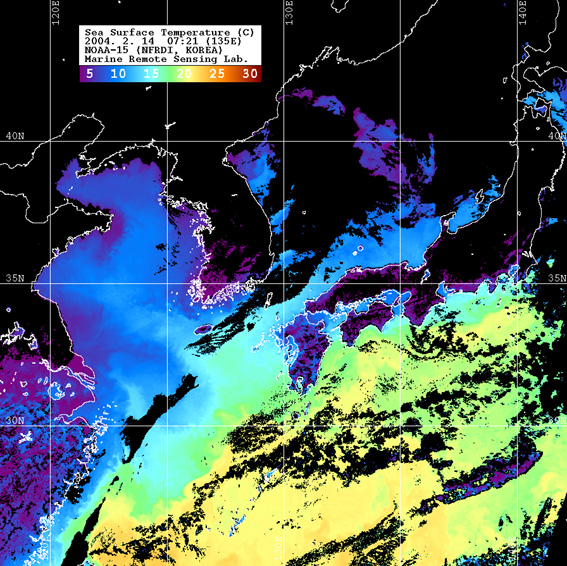 o 2004년 02월 14일 07시 21분 NOAA-15호 위성영상입니다. o 수온분포는 범례를 참고하시기 바랍니다. o 검은색은 구름과 육지를 나타냅니다.