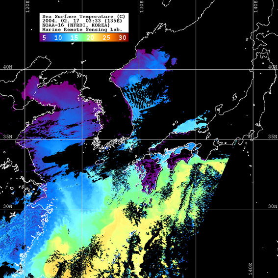 o 2004년 02월 17일 03시 33분 NOAA-16호 위성영상입니다. o 수온분포는 범례를 참고하시기 바랍니다. o 검은색은 구름과 육지를 나타냅니다.