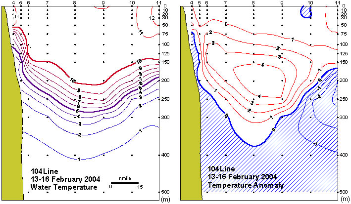 ㅇ2004년 2월 13∼16일 국립수산과학원 동해수산연구소에서 조사한 104선(죽변 동방)의 수직수온분포도 및 평년편차도 입니다.