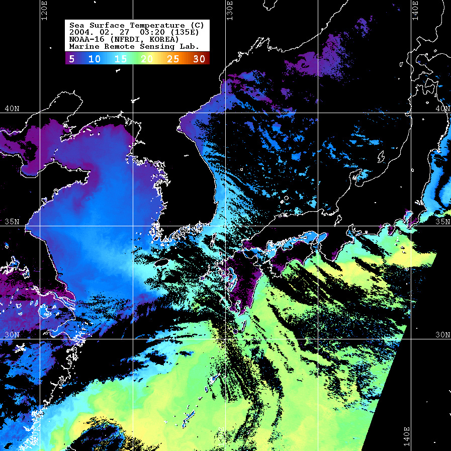 o 2004년 02월 27일 03시 20분 NOAA-16호 위성영상입니다. o 수온분포는 범례를 참고하시기 바랍니다. o 검은색은 구름과 육지를 나타냅니다.