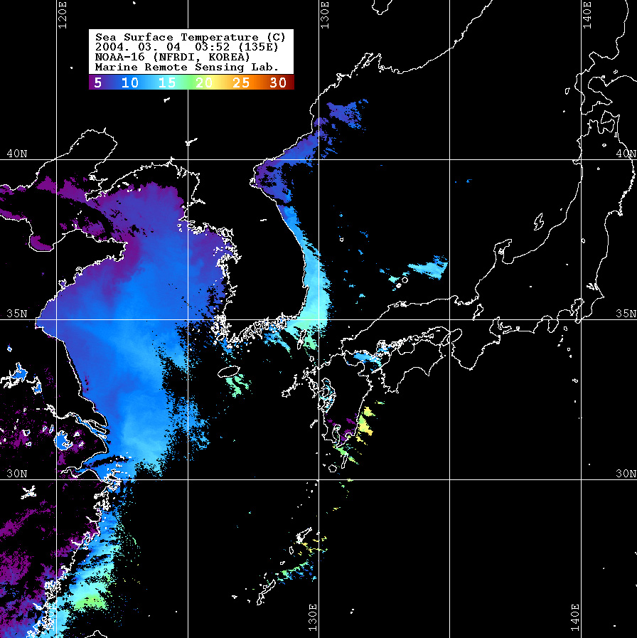 o 2004년 03월 04일 03시 52분 NOAA-16호 위성영상입니다. o 수온분포는 범례를 참고하시기 바랍니다. o 검은색은 구름과 육지를 나타냅니다.