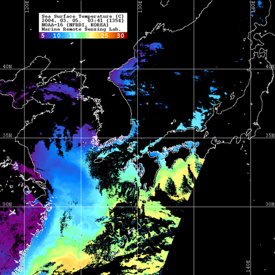 o 2004년 03월 05일 03시 41분 NOAA-16호 위성영상입니다. o 수온분포는 범례를 참고하시기 바랍니다. o 검은색은 구름과 육지를 나타냅니다.