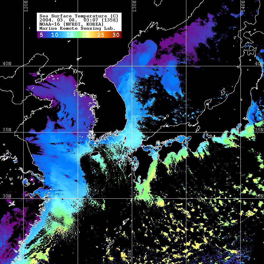 o 2004년 03월 08일 03시 07분 NOAA-16호 위성영상입니다. o 수온분포는 범례를 참고하시기 바랍니다. o 검은색은 구름과 육지를 나타냅니다.