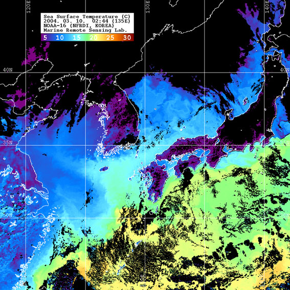 o 2004년 03월 10일 02시 44분 NOAA-16호 위성영상입니다. o 수온분포는 범례를 참고하시기 바랍니다. o 검은색은 구름과 육지를 나타냅니다.