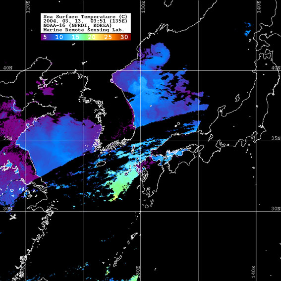 o 2004년 03월 13일 03시 51분 NOAA-16호 위성영상입니다. o 수온분포는 범례를 참고하시기 바랍니다. o 검은색은 구름과 육지를 나타냅니다.