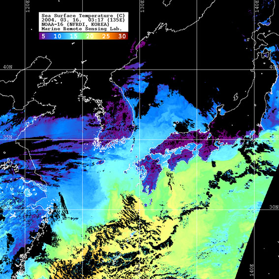 o 2004년 03월 16일 03시 17분 NOAA-16호 위성영상입니다. o 수온분포는 범례를 참고하시기 바랍니다. o 검은색은 구름과 육지를 나타냅니다.