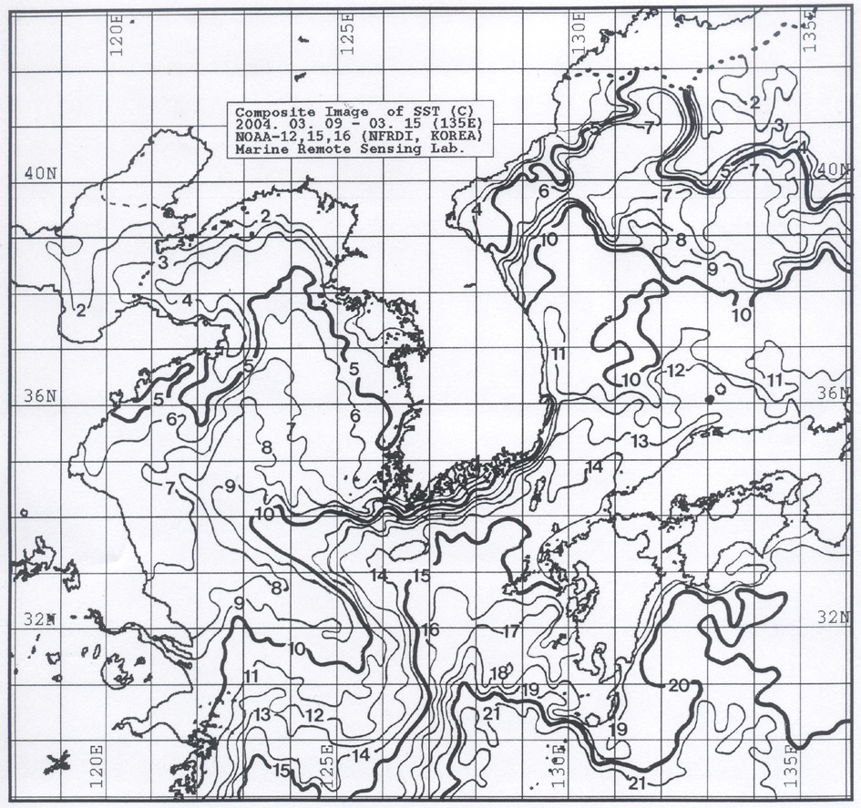 o 아래 그림은 2004년 3월 9일부터 3월 15일 까지 합성한 위성추정 표면 수온 분포도입니다. o 대화퇴 근해 4∼6도, 울릉도 근해 10∼11, 대마도 근해 14∼15도, 제주도 근해 14∼15도, 이어도 근해 9∼10도, 일향초 근해 10∼11도, 어청도 근해 5∼6도 내외로 나타납니다. o「평년에 비해」수온은 대화퇴 근해 1도 낮게, 울릉도 근해 및 대마도 근해 0.5도 높게, 제주도 및 이어도 근해 비슷하게, 일향초 1도 높게, 어청도 근해 비슷하게 나타납니다. o 수온전선대는 수온 11도를 중심으로 이어도 동쪽 90km 외해와 거문도∼거제도를 잇는 해역에서 형성됩니다. < 위의 그림을 클릭하시면 확대된 수온정보를 보실 수 있습니다 >