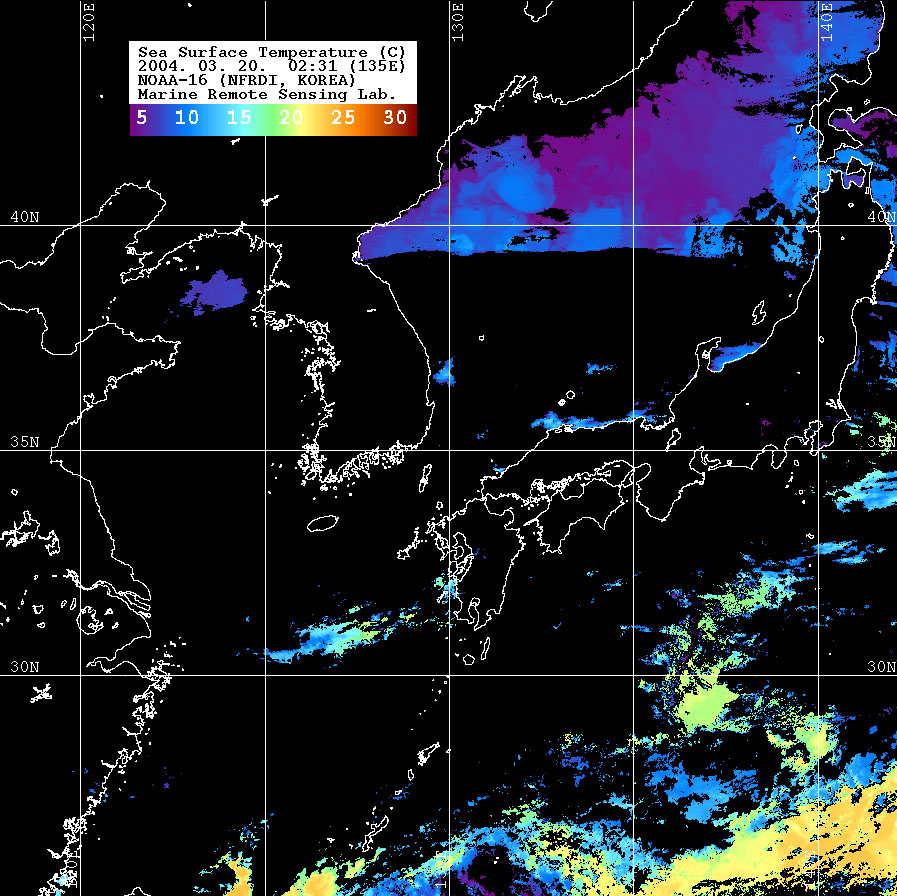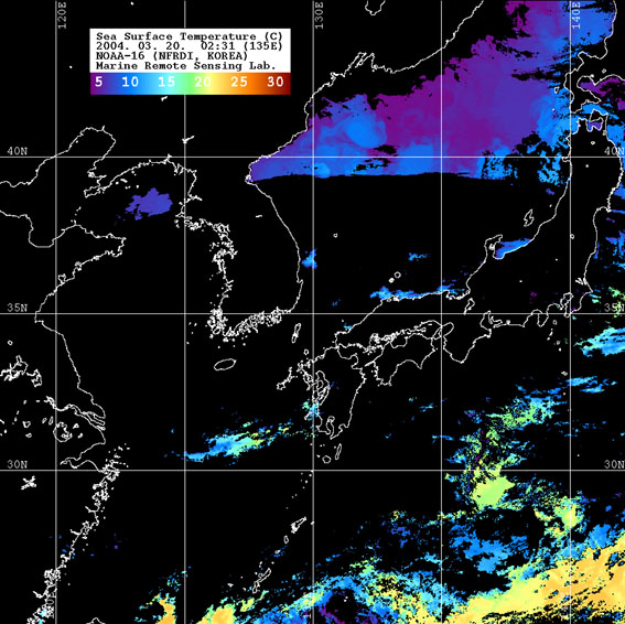 o 2004년 03월 20일 02시 31분 NOAA-16호 위성영상입니다. o 수온분포는 범례를 참고하시기 바랍니다. o 검은색은 구름과 육지를 나타냅니다.