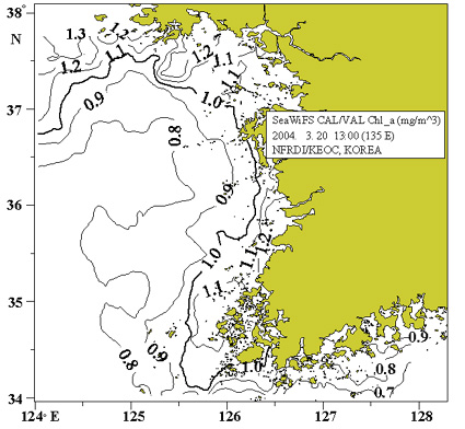 o 비교적 조밀한 기초먹이생물량(클로로필 a) 분포가 농도 1.0 mg/m3를 중심으로 서해 연안을 따라 나타나고 있습니다.