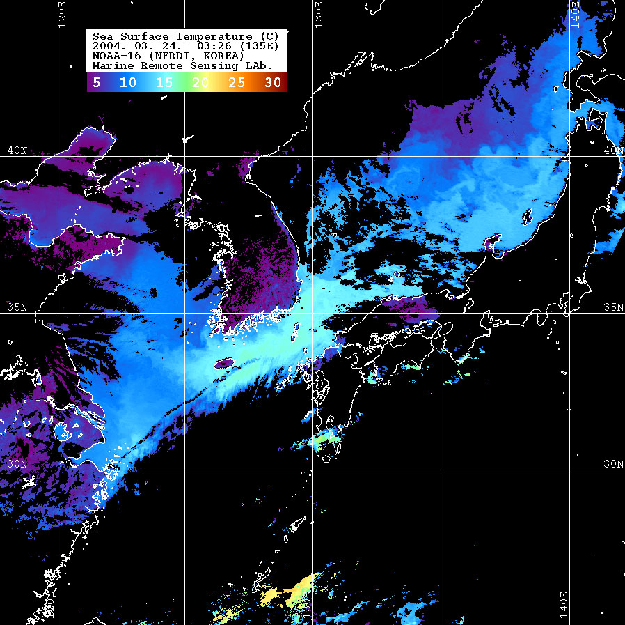 o 2004년 03월 24일 03시 26분 NOAA-16호 위성영상입니다. o 수온분포는 범례를 참고하시기 바랍니다. o 검은색은 구름과 육지를 나타냅니다.
