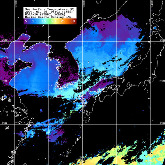 o 2004년 03월 26일 03시 03분 NOAA-16호 위성영상입니다. o 수온분포는 범례를 참고하시기 바랍니다. o 검은색은 구름과 육지를 나타냅니다.