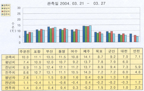 o 최근(2004.03.21∼03.27)의 한반도 연안 표면수온은 동해 연안역에서 섭씨 10∼11도, 남해 연안역에서 11∼14도, 서해 연안역에서 7∼9도로 나타납니다.