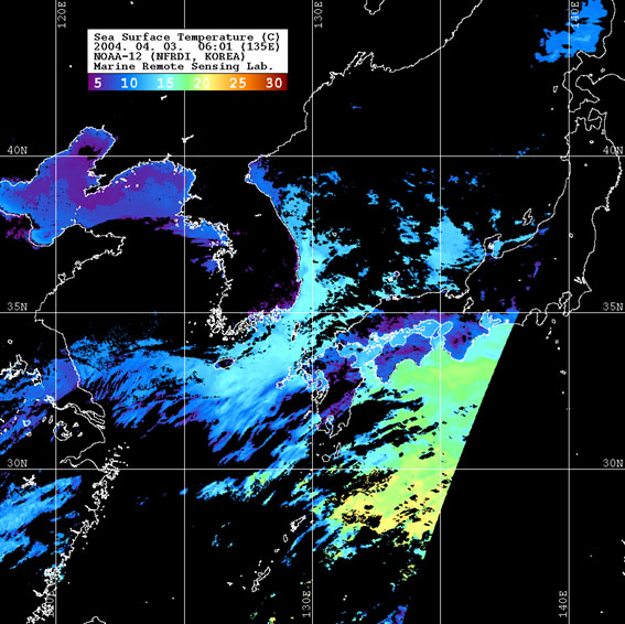 o 2004년 04월 03일 06시 01분 NOAA-12호 위성영상입니다. o 수온분포는 범례를 참고하시기 바랍니다. o 검은색은 구름과 육지를 나타냅니다.