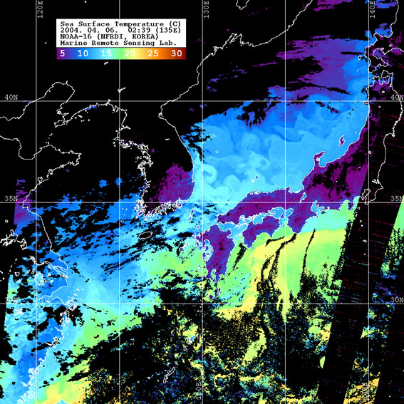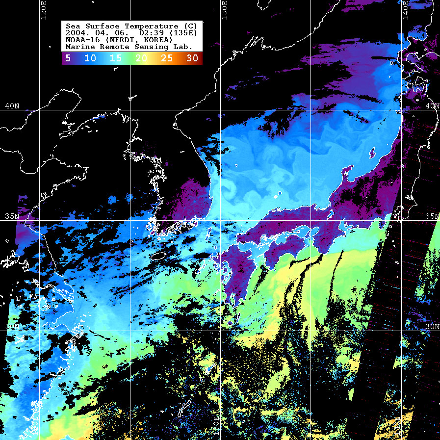 o 2004년 04월 06일 02시 39분 NOAA-16호 위성영상입니다. o 수온분포는 범례를 참고하시기 바랍니다. o 검은색은 구름과 육지를 나타냅니다.