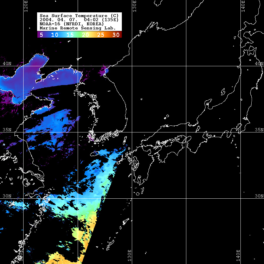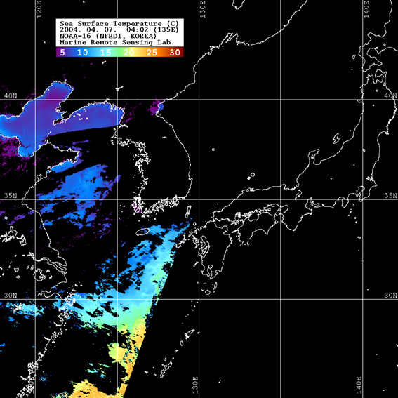 o 2004년 04월 07일 04시 02분 NOAA-16호 위성영상입니다. o 수온분포는 범례를 참고하시기 바랍니다. o 검은색은 구름과 육지를 나타냅니다.