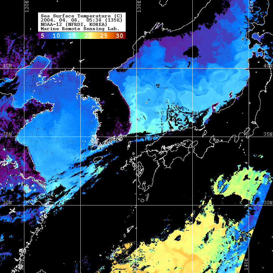 o 2004년 04월 08일 05시 38분 NOAA-12호 위성영상입니다. o 수온분포는 범례를 참고하시기 바랍니다. o 검은색은 구름과 육지를 나타냅니다.