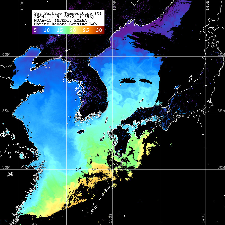o 2004년 04월 09일 07시 24분 NOAA-15호 위성영상입니다. o 수온분포는 범례를 참고하시기 바랍니다. o 검은색은 구름과 육지를 나타냅니다.